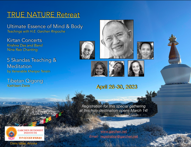 H.E. Garchen Rinpoche will give pith instructions on the ultimate essence of mind and body, illuminating your true nature. We are delighted to welcome Krishna Das and his band to lead us in truly heart opening devotional chanting.